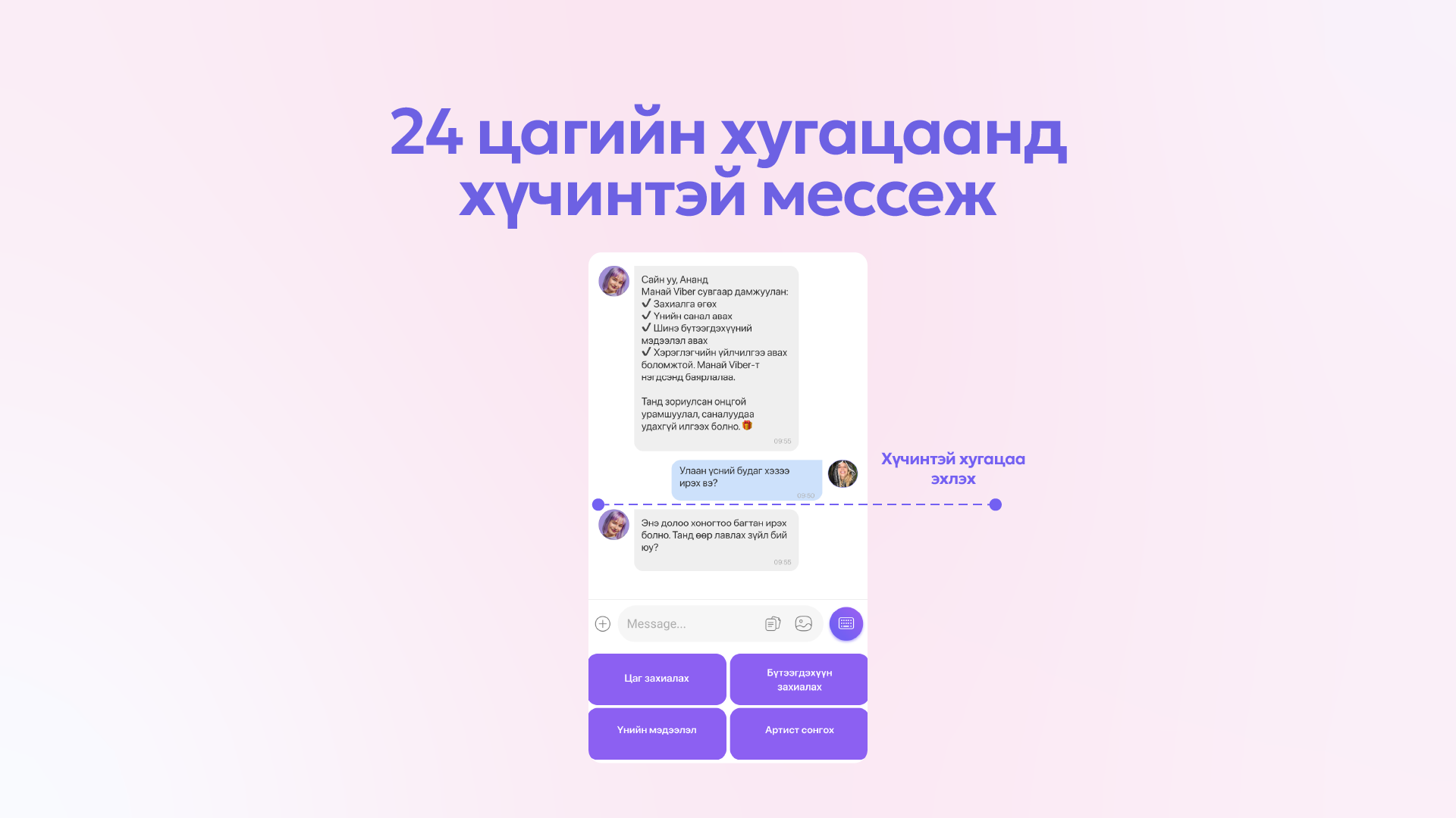 Viber чатботоо Viber дээрх сурталчилгаа болон мессежтэйгээ холбож, бүтээгдэхүүнтэй танилцахаас эхлээд шаардлагатай бүхий л үед нэг платформ, нэг сувгаар харилцах боломжтой.