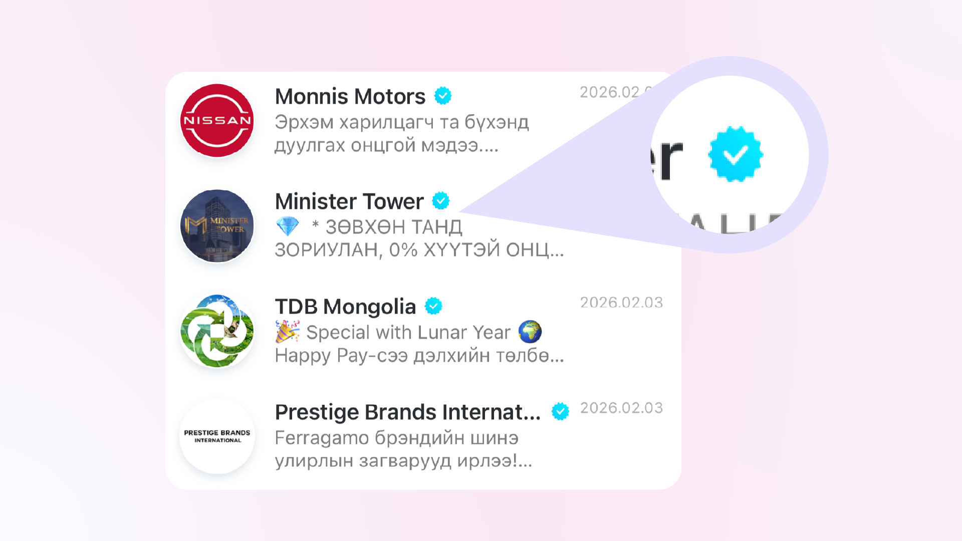Viber чатбот нь албан ёсоор баталгаажиж, цэнхэр тэмдэглэгээ (blue tick) авдаг. Энэ нь хэрэглэгчдэд жинхэнэ, баталгаатай газартай харилцаж буйг илтгэж, итгэлцлийг нэмэгдүүлдэг.